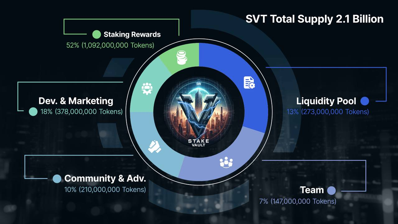 The native token of Stake Vault, SVN, has a defined total supply of 2,100,000,000 tokens. This strategic allocation is designed to support the platform’s growth, incentivize community engagement, and sustain long-term development. The allocation is detailed as follows: